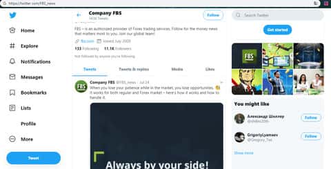 Так же обзавелись шулера FBS и страницей в социальной сети Твиттер, в которой они накрутили около десяти тысяч подписчиков. Аналогично предыдущей странице в социальной сети мошенников ФБС никакой активности на ней не наблюдается. На изображении, расположенном ниже, вы можете увидеть страницу лохотрона FBS в социальной сети Twitter.