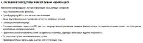 После в политике конфиденциальности жуликов FBS следует "вода" о том, что аферисты ФБС собирают личную и персональную информацию клиентов. А завершается политика конфиденциальности у мошенников FBS информацией о том, что жулики могут распространять личную и персональную информацию клиентов довольно объемному списку третьих лиц, о чем вы можете прочесть ниже.