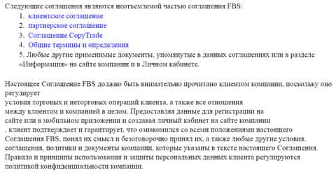Начинаются условия сотрудничества у аферистов FBS с информации о том, что пользователи фактом своей регистрации принимают все условия сотрудничества с лохотроном ФБС, а так же со всеми дополнительными документами, предоставляемыми жуликами FBS. На изображении, расположенном ниже, вы можете увидеть начало условий сотрудничества шулеров ФБС.