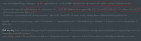 Дополнительным преимуществом для лохотрона ФБС является факт их оффшорной регистрации, а именно: Ajeltake Road, Ajeltake Island, Majuro, Marshall Islands MH96960, что дает жуликам FBS анонимность счетов и анонимность их владельцев, к тому же все суды с жуликами ФБС по закону будут происходить только непосредственно на территории оффшора.