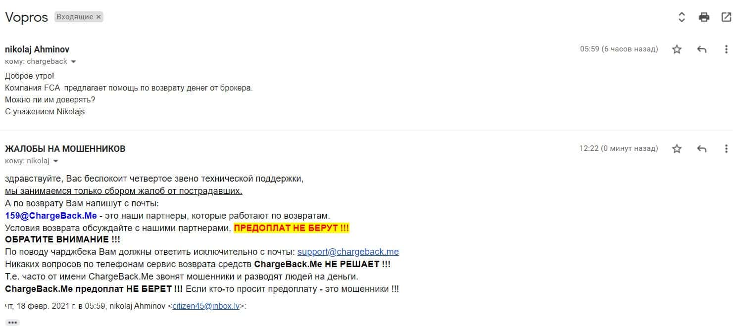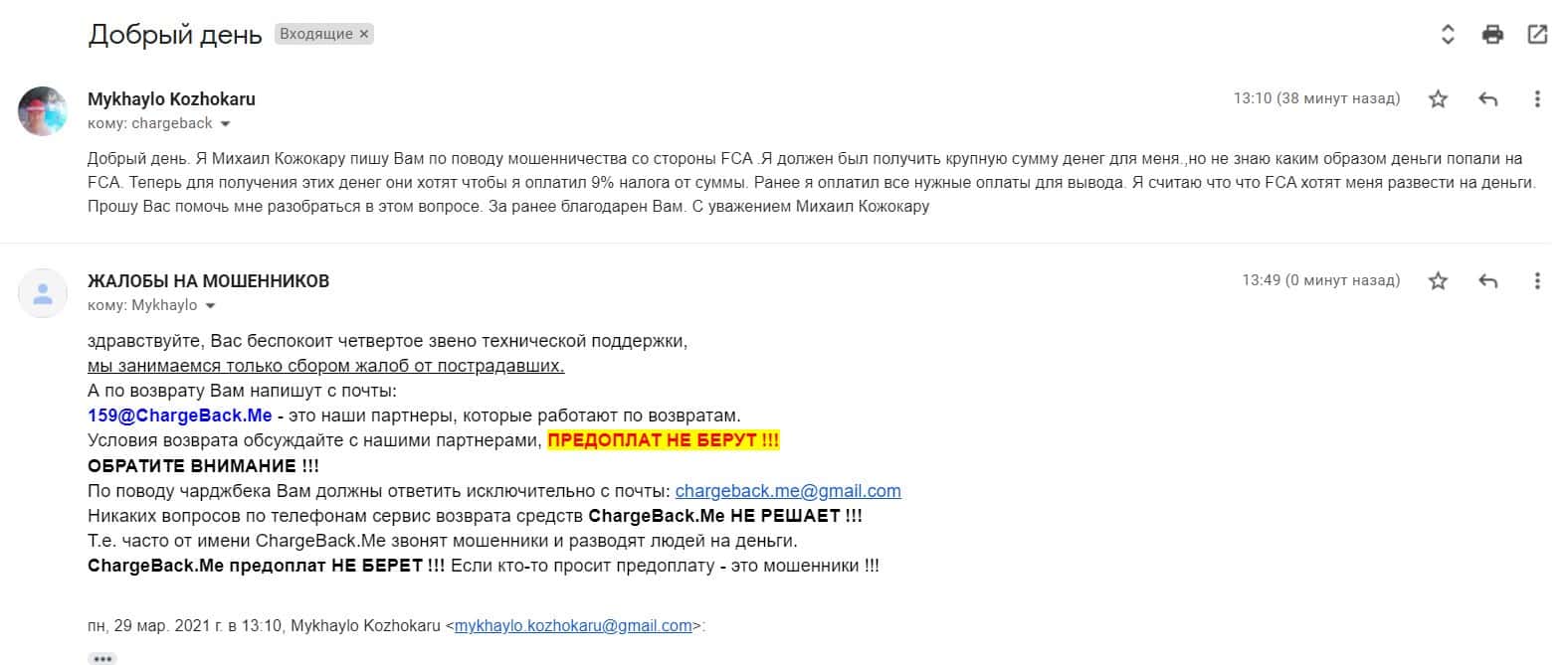 В том случае если циничные воры FCA Вас слили или хотели это сделать, то в такой ситуации сообщите е-майл ниже, и мы без сомнения с Вами установим связь по электронке.