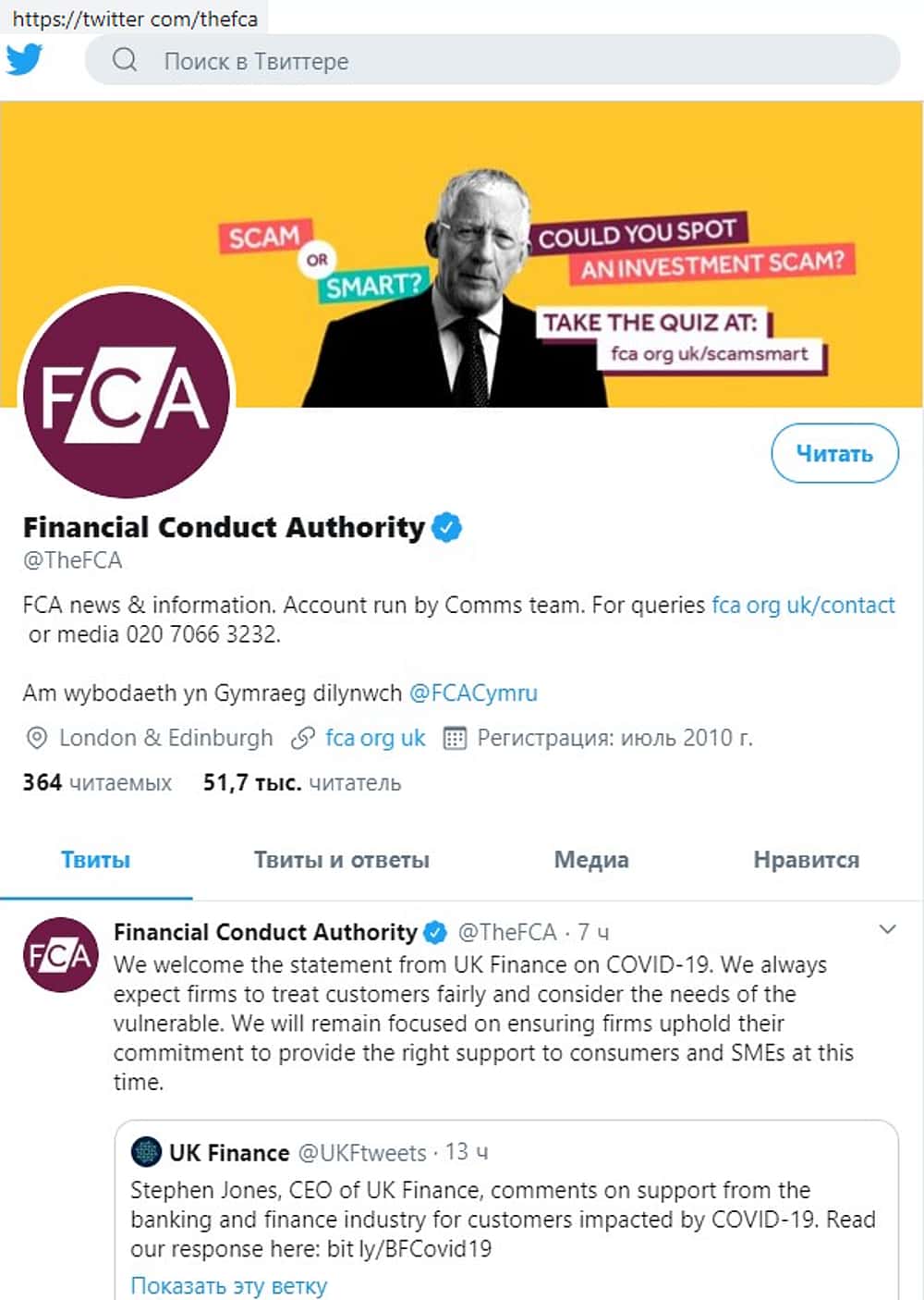 В социальных сетях авантюристы тоже позаводили свои странички. Например, их аккаунт в сети коротких постов twitter com. Страничка представляет собой набор постов с рекламными видеороликами, предупреждениями или какими-либо новостями. В целом сухой канал который должен показать серьезность авантюрного регулятора FCA.