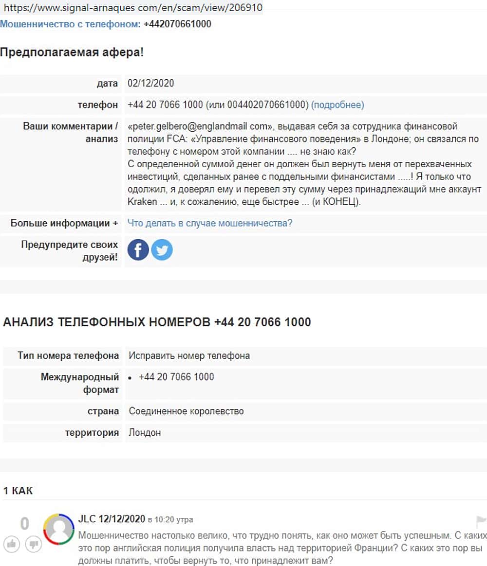 Но это еще не все. Номер телефона лохотрона FCA оказался у некоторых людей в немилости. Например, с него, по сообщению на портале signal-arnaques com, неизвестный мошенник позвонил потерпевшему и предложил вернуть потерянные деньги за определенную сумму. Это типичная схема работы псевдорегуляторов.