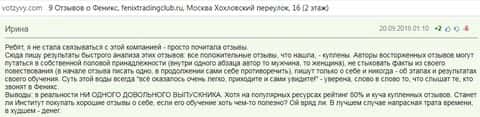 Для завлечения самих будущих лохов используются стандартные схемы, одной из которых, наряду с обзвонами, являются покупные отзывы. Отличает покупные отзывы от настоящих одна простая вещь – отсутствие конкретики. Только ключевые слова, которые даёт "работодатель" копирайтеру, который за 100 рублей наполняет Сеть сомнительного качества отзывами о Fenix Trading Club и незаслуженно повышает в Интернете рейтинг данной конторы.