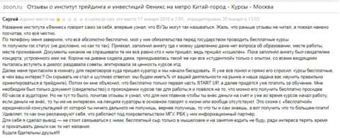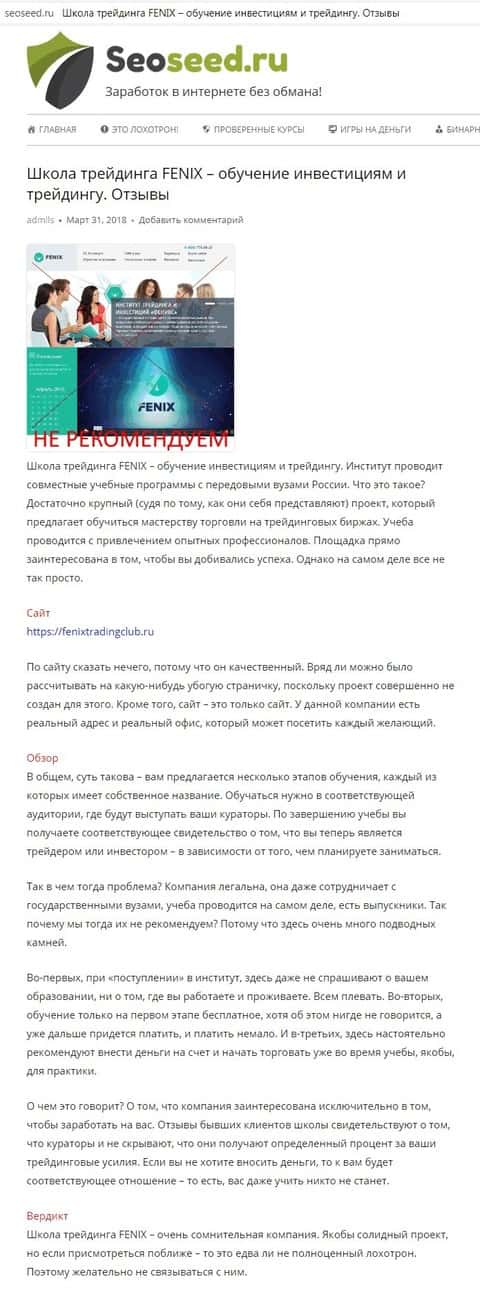Уважаемый веб-ресурс сеосид ру также высказался об аферистах Fenix Trading Club. При чём высказался он с главной претензией к этой конторе. Она просто-напросто разводит людей на деньги. Даже не гиблыми инвестициями, а простыми тренингами, по отзывам как опытных трейдеров, так и самих редакторов seoseed ru, никакой ценности денные тренинги не представляют, и созданы исключительно для того, чтобы получать прибыль с людей, наивно полагающий, что с жуликами Феникс они могут чему-то научится. К сожалению, не могут.
