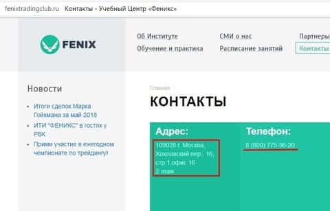 Жулики Fenix Trading Club имеют офис в Москве, в котором проводят как свои псевдо занятия, так и обрабатывают новых лохов, которых разводят на вклад в свою контору. Вот сами контакты, представленный на их сайте: