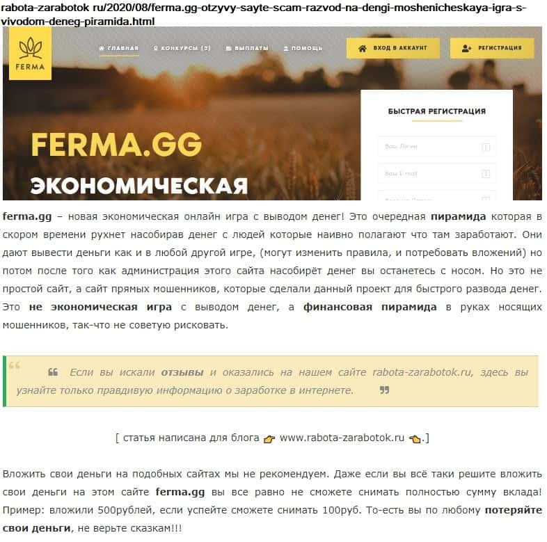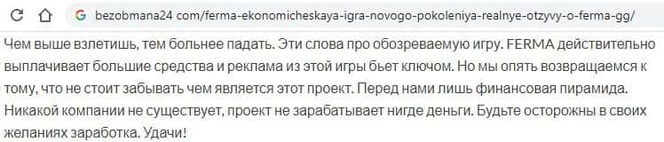 Первый же авторитетный источник в интернете прямо говорит о том, что Ферма ГГ - это никакая не экономическая игра, а самая обычная финансовая пирамида.