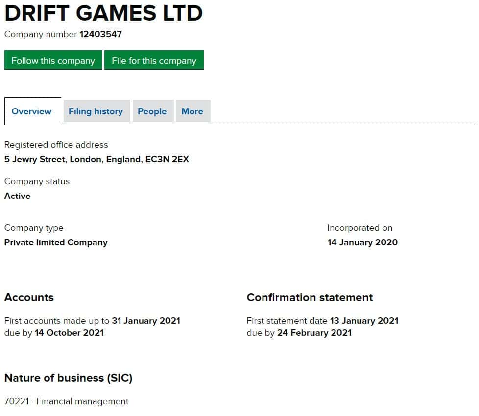 Drift Games Limited 5 Jewry Street, London EC3N 2EX