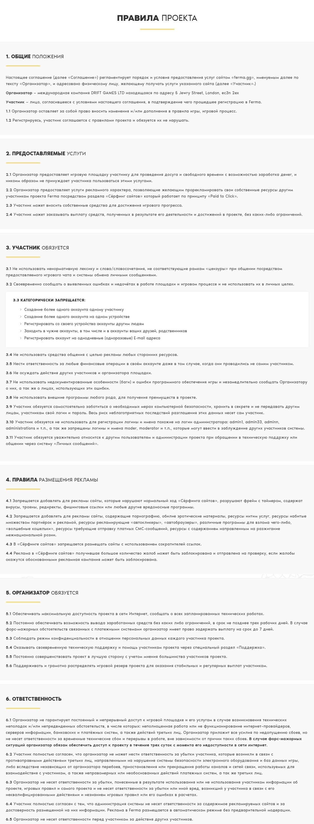 Ниже приведет полный договор мошеннической конторы Ferma GG, который и будет регулировать ваши взаимоотношения с ними.