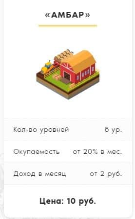 Первый тип счета, в который предлагают вложиться жулики Ферма ГГ - "Амбар". Стоимость входа - 10 рублей и фиксированная окупаемость 20% в месяц.