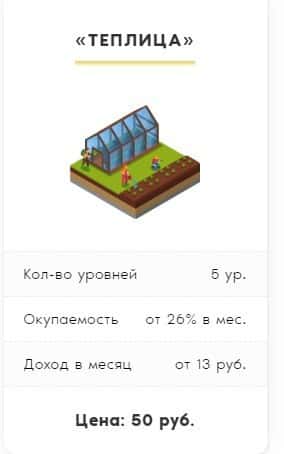 Второй ти счета, в который предлагают вложиться жулики Ферма ГГ - "Теплица". Здесь цена входа составляет 50 рублей и окупаемость составляет 26% в месяц.