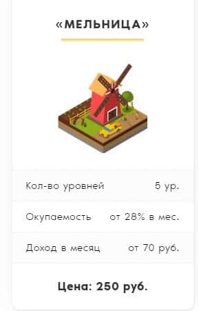 Третий тип счета, в который предлагают вложиться жулики Ферма ГГ - "Мельница". Сюда цена входа составляет 250 рублей под 28% в месяц.