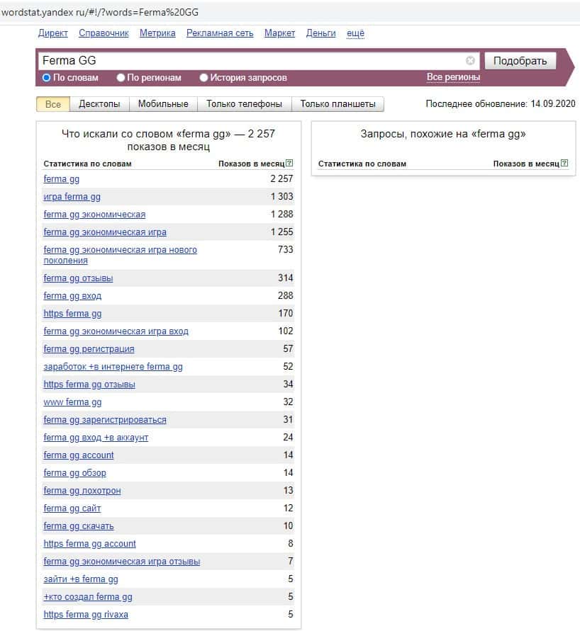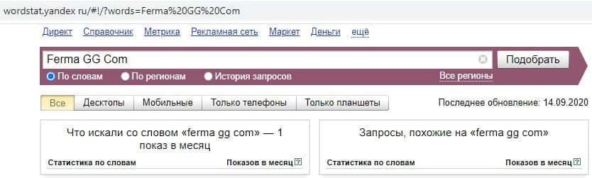- Какое количество запросов по Ферма ГГ показывает Яндекс?