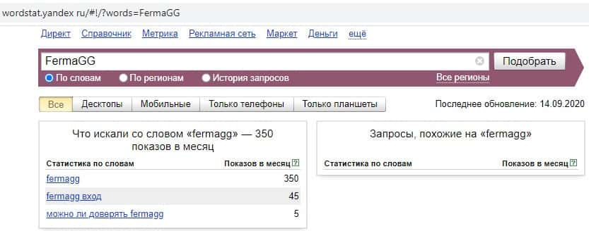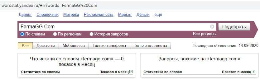 Второй запрос на английском языке в яндексе только без пробела"FermaGG" выдает результат в 350 показов в месяц. Это намного меньше, чем в предыдущем случае.