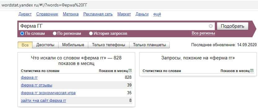 Переходим к запросам на русском языке. Первый запрос на русском языке в яндекс "Ферма ГГ" выдает 828 показов в месяц.