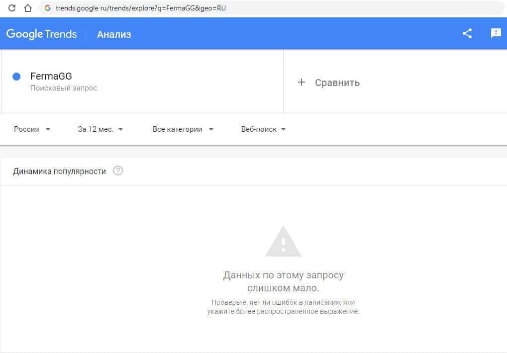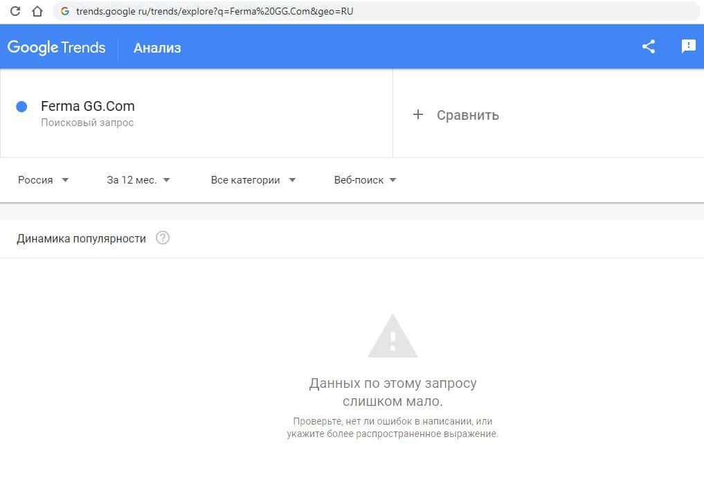 И последний запрос в Гугл на русском языке "ФермаГГ" выдает ожидаемый результат в 0 показов в месяц, как и в предыдущих случаях.