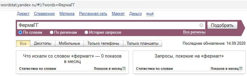 Переходим к запросам на русском языке. Первый запрос на русском языке с пробелом "Ферма ГГ" выдает результат в 0 показов в месяц.