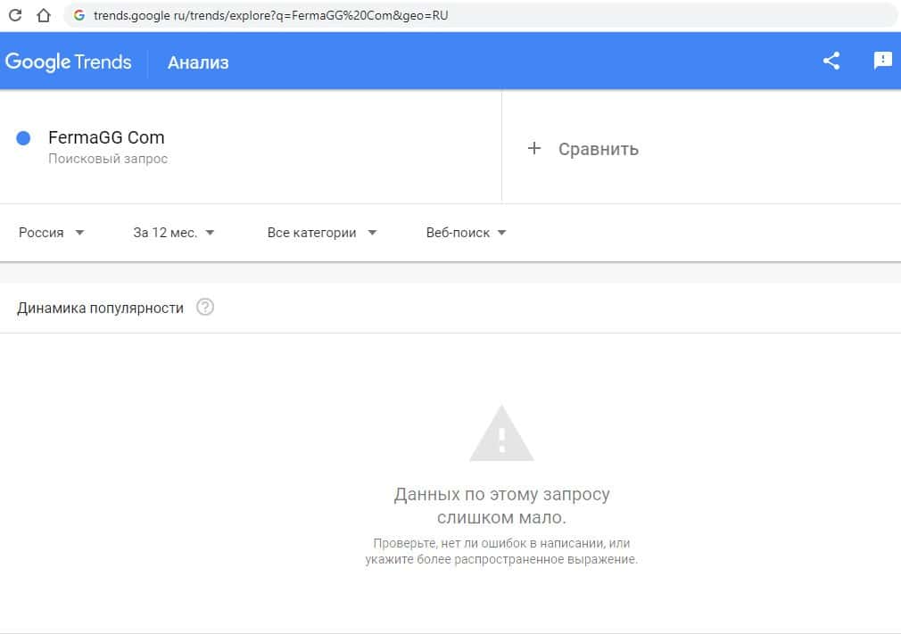 Такой же запрос в Гугл на английском языке без пробела и с точкой "FermaGG.Com" выдает результат в 0 показов в месяц, как и в предыдущих случаях.