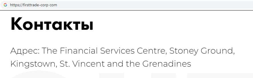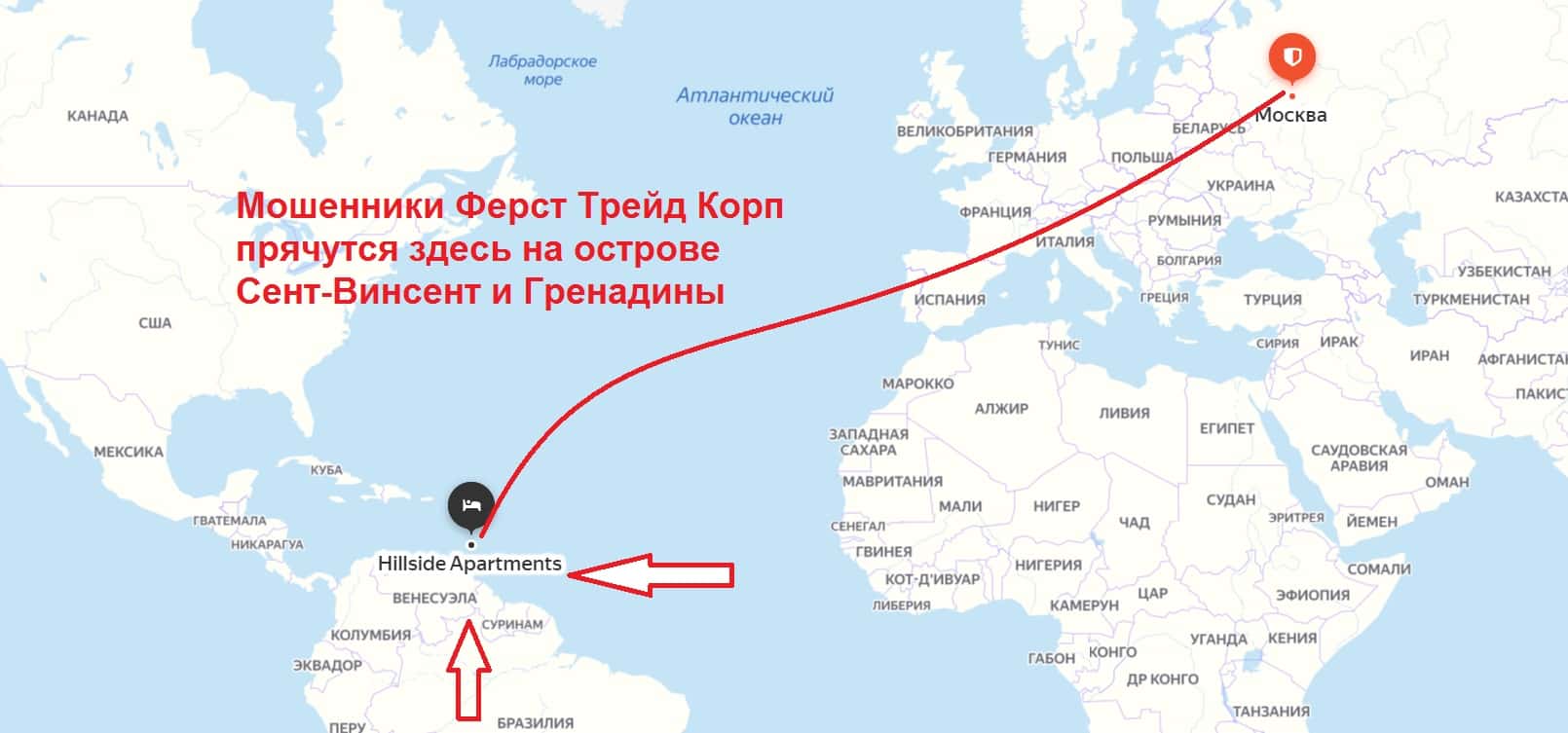 Главный офис данного интернет-лохотрона под названием Ферст Трейд Корп находится в одном из оффшоров на острове Сент-Винсент и Гренадины.