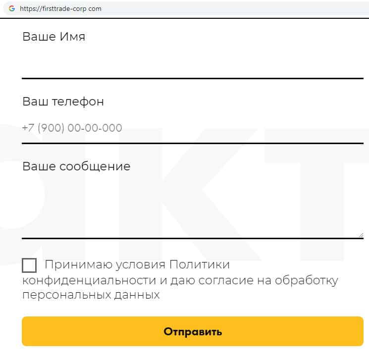 Мошенники Ферст Трейд Корп конкретного юридического лица с формой собственности не указывают, а вместо этого указали часть названии компании, а именно: First Trade.