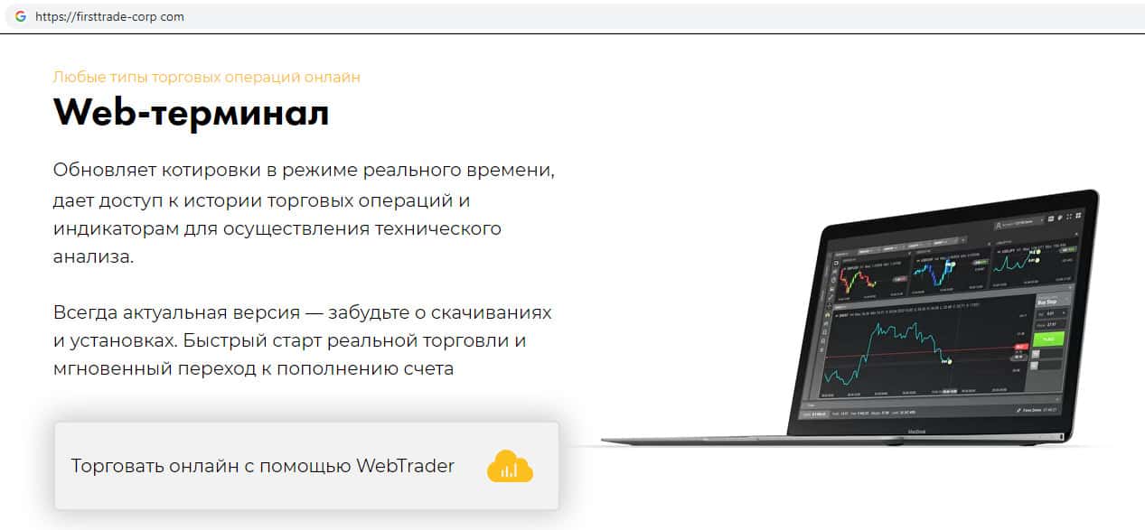 Жулики FirstTrade Corp на своем дырявом сайте предлагают торговать при помощи сомнительного происхождения веб-платформы, чего делать не рекомендуем !!!