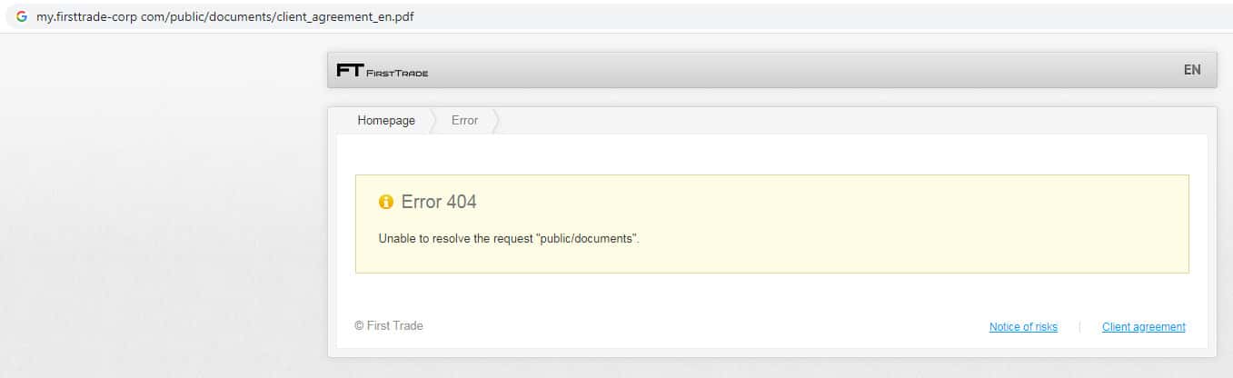 При попытке открыть клиентское соглашение на дырявом сайте псевдо-брокерской организации Ферст Трейд Корп появляется уведомление с системной ошибкой.