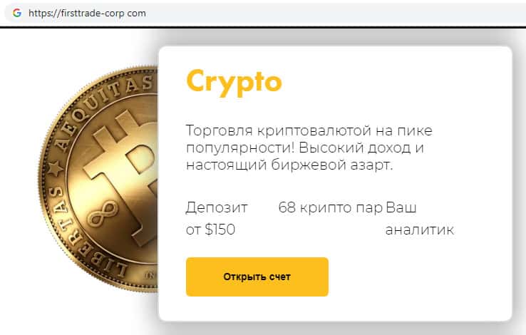 Второй тип торгового счета на сайте псевдо-брокерской организации FirstTrade Corp называется Crypto, где минимальный депозит составляет также 150 долларов.