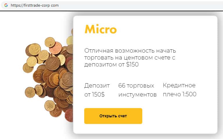 Также шулера FirstTrade Corp на своем дырявом сайте предлагают тип торгового счета Micro, где минимальный депозит говорит о том, что перед нами банальный интернет-лохотрон.