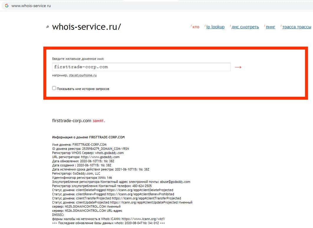- Возраст домена мошеннической организации Ферст Трейд Корп
