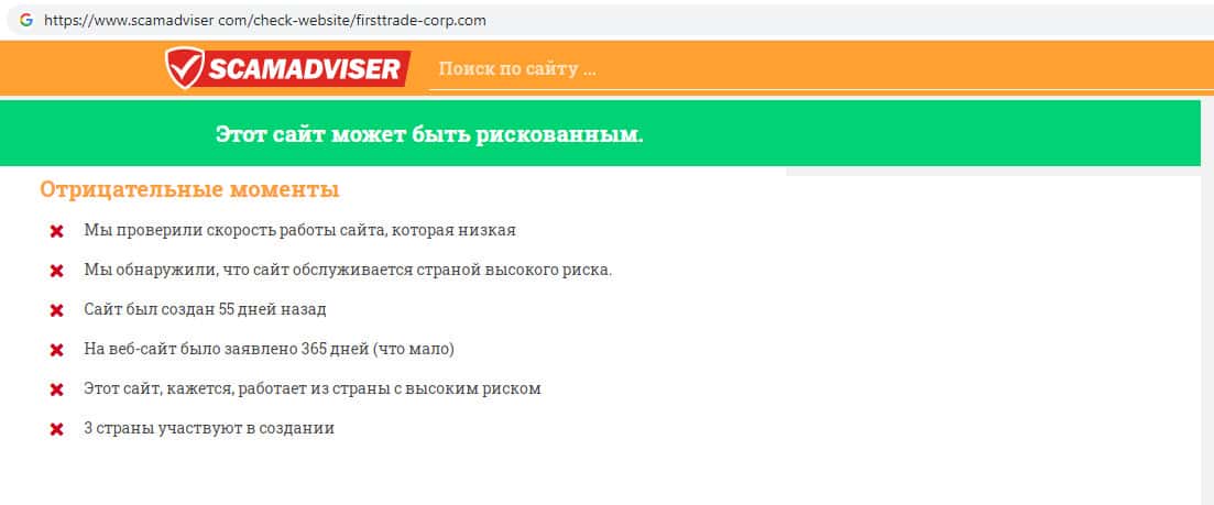 Проверка Ферст Трейд Корп на сайте скамадвайсер ком показала, что у данный сайт может быть рискованным, а также выявлено множество отрицательных моментов в работе сервера.