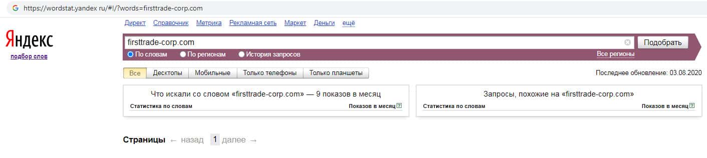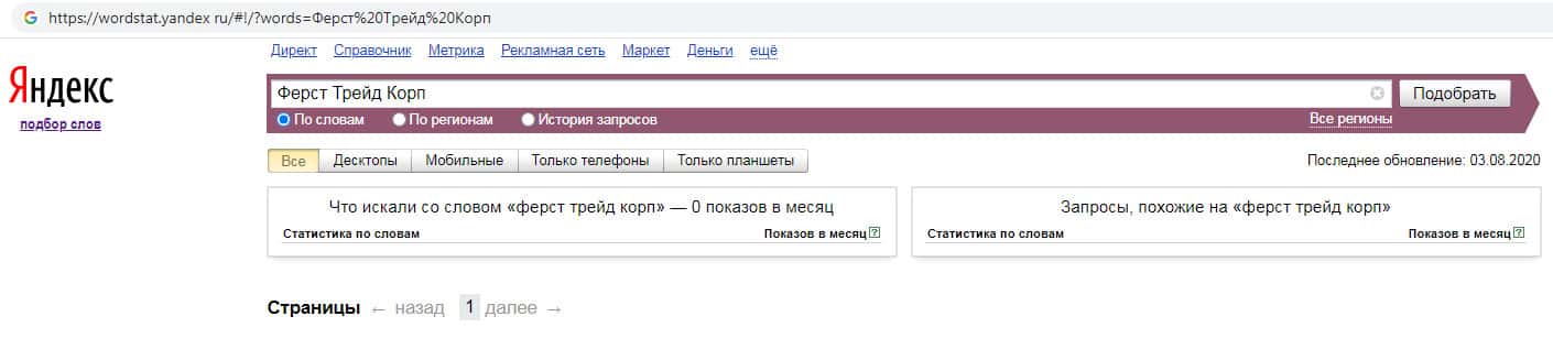 О брендовых запросах названия компании на русском языке с пробелом "Ферст Трейд Корп" на wordstat yandex ru также нет никакой информации.