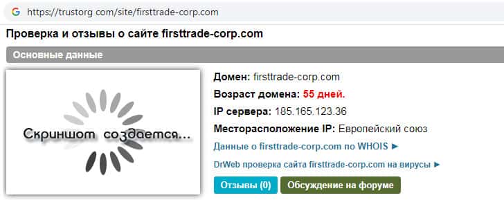Проверка интернет-сервиса аферистов FirstTrade Corp на trustorg com показала, что возраст домена к моменту написания статьи составляет 55 дней.