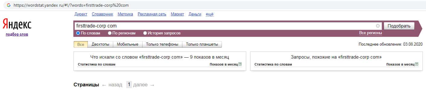 О запросах по бренду русскоязычного названия компании без пробелов "ФерстТрейдКорп" на Яндекс Вордстарт данные отсутствуют.