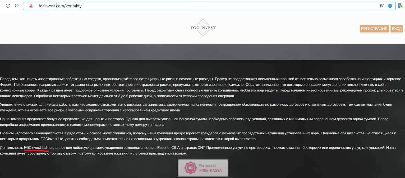Юридическим лицом, работающим от лица брокерской компании ФГС Инвест, является FGCinvest Ltd. Информация об этом есть внизу главной страницы сайта.