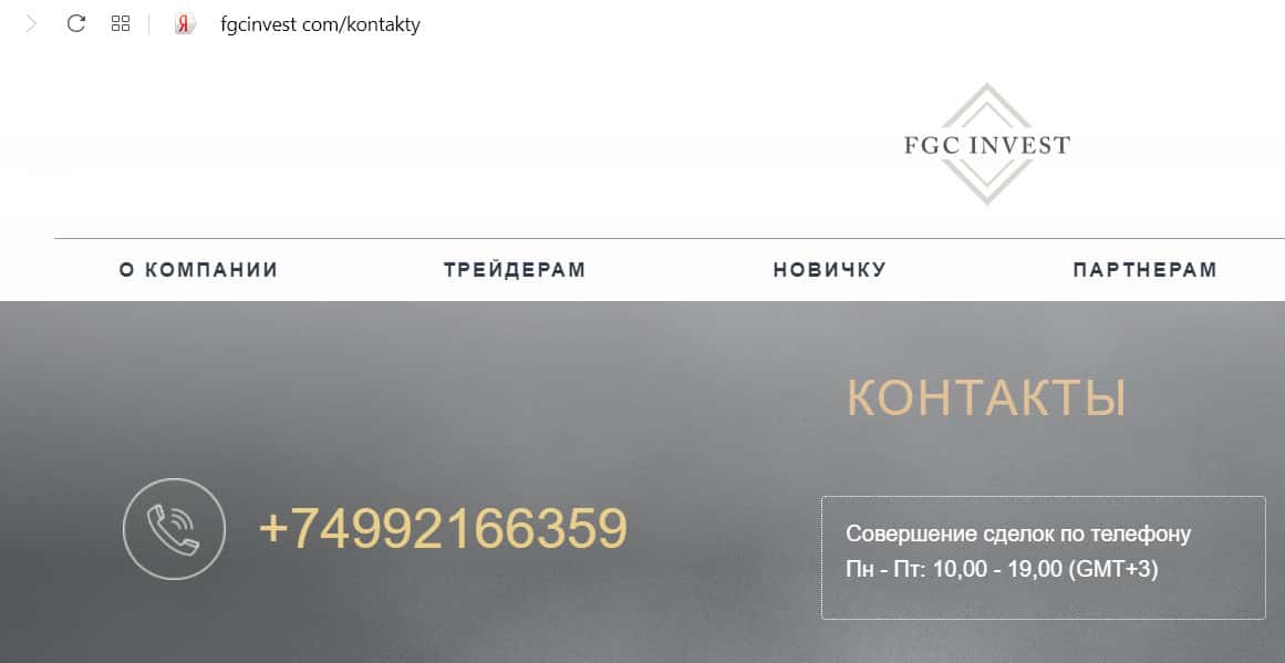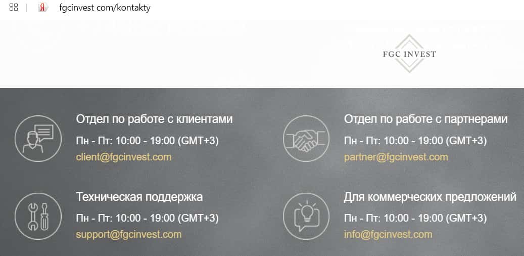 Кроме одного номера телефона, у мошенников нет других способов связи, за исключением четырех адресов электронной почты. Связи с техподдержкой на сайте FGCInvest нет.