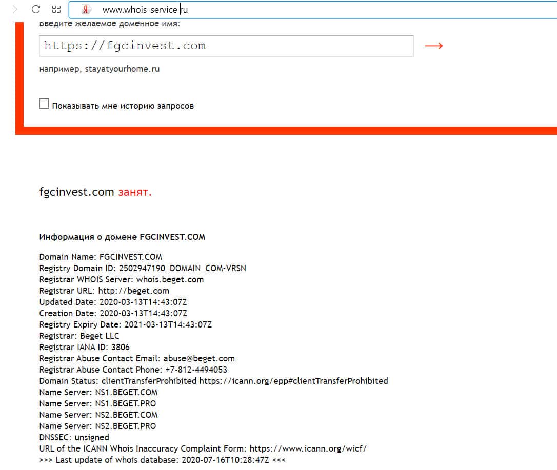 Как показала проверка доменного имени сайта ФГС Инвест, владелец ресурса скрыл свое название. Это неудивительно, поскольку контора явно мошенническая.