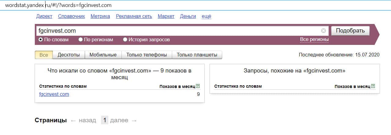 Данные по запросам того же домена "fgcinvest com", но без точки с пробелом, соответствуют таким цифрам: 9 показов за месяц.
