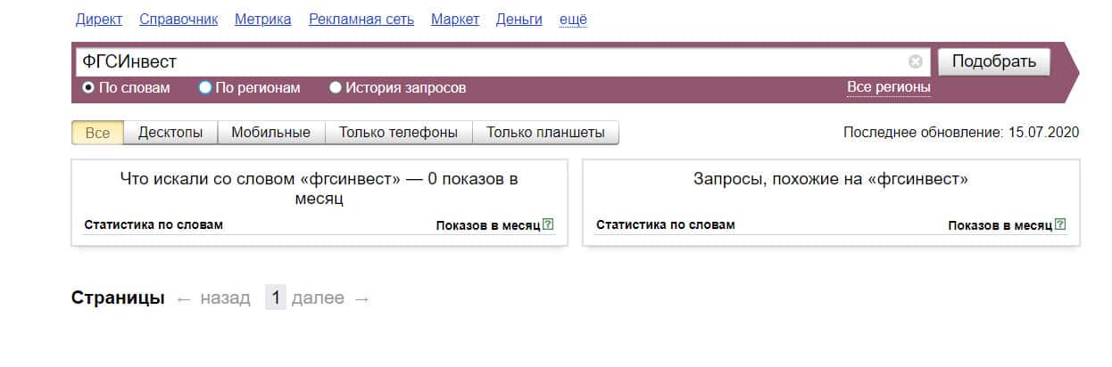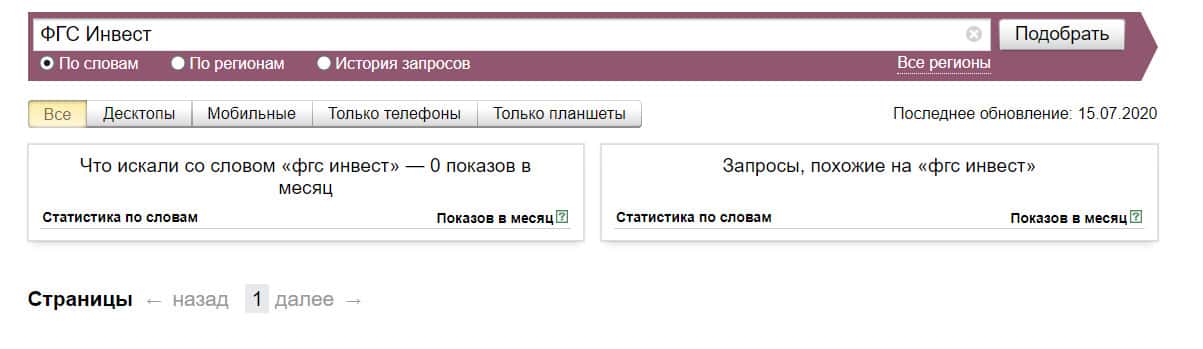 Посмотрим, какое количество пользователей пытались найти бренд "ФГС Инвест", написанный на русском языке. Результат равен нулю - компания явно не популярна в России.