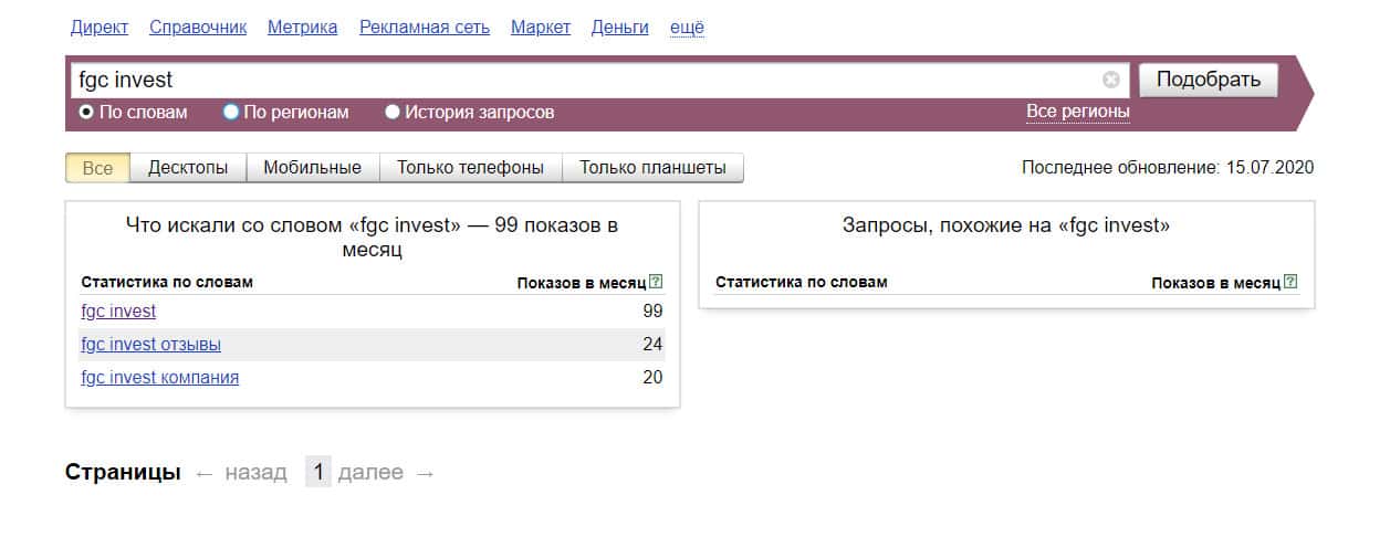 Если написать в строке поиска Яндекс название бренда с пробелом "fgc invest", то количество запросов увеличится до 99 раз. Это связано с понятием инвестирования.