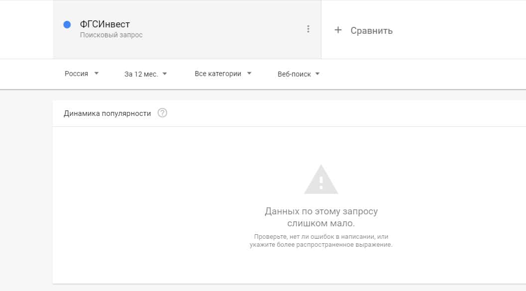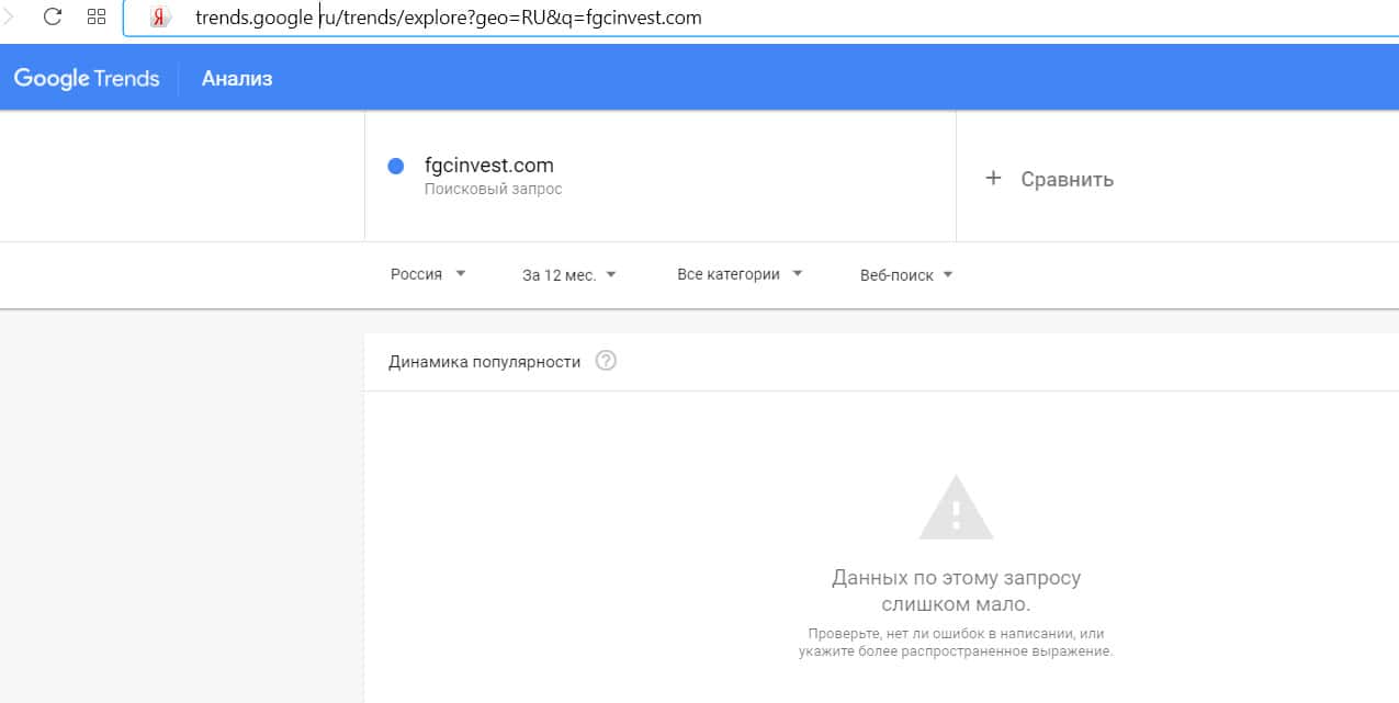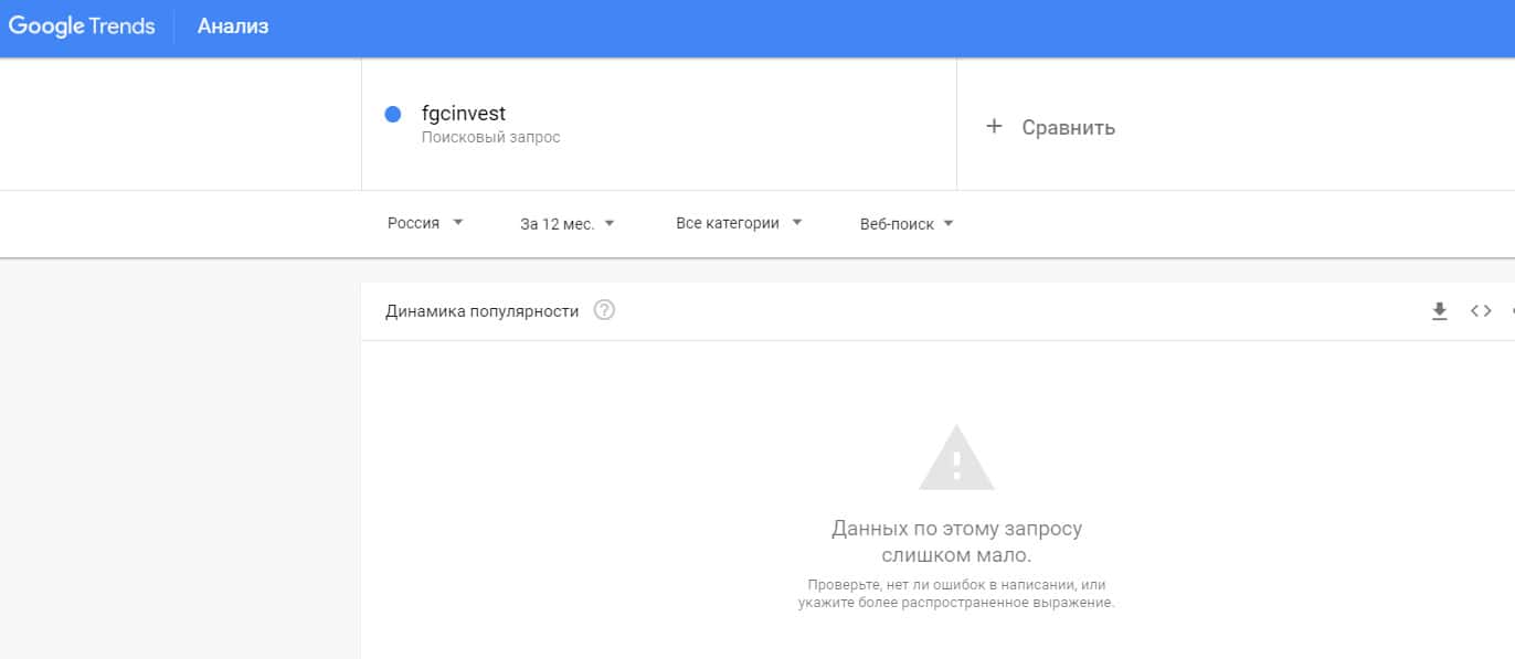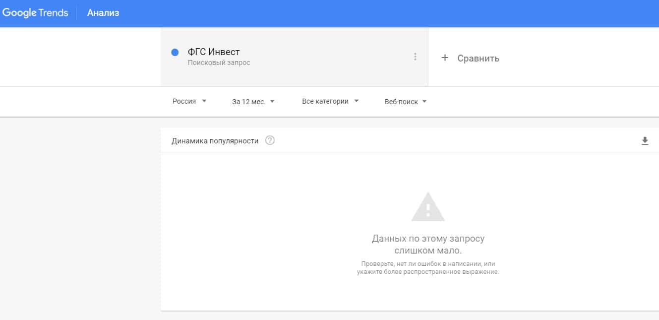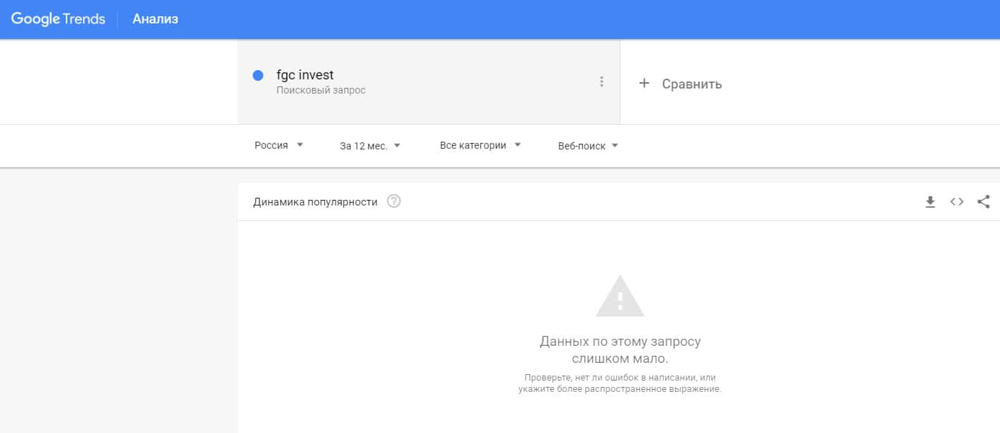Точно такое же количество показов сервис Гугл Тренд выдает по запросу бренда "ФГСИнвест", написанного без пробела. Им никто не интересуется.