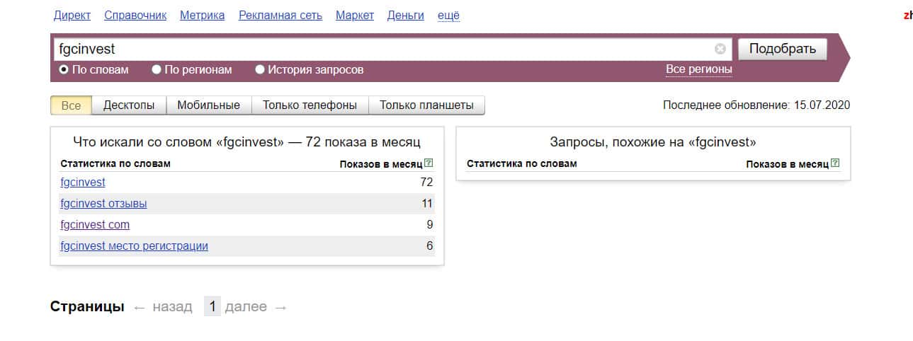 Название бренда на английском языке "fgcinvest" пользователи пытались найти в поисковике Яндекс 72 раза за месяц.