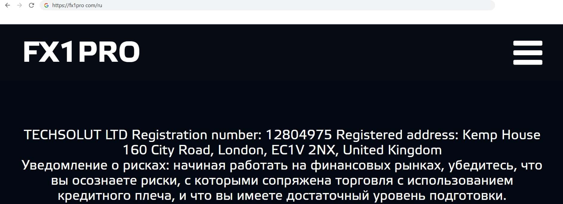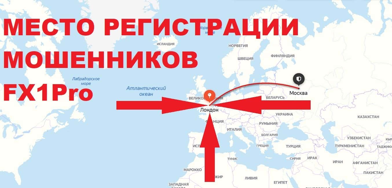 Компания финансовых разводил FX1Pro указала, что зарегистрирована в Лондоне, но доверять этой информации не стоит, так как мошенники часто используют этот адрес для своего лохотрона.