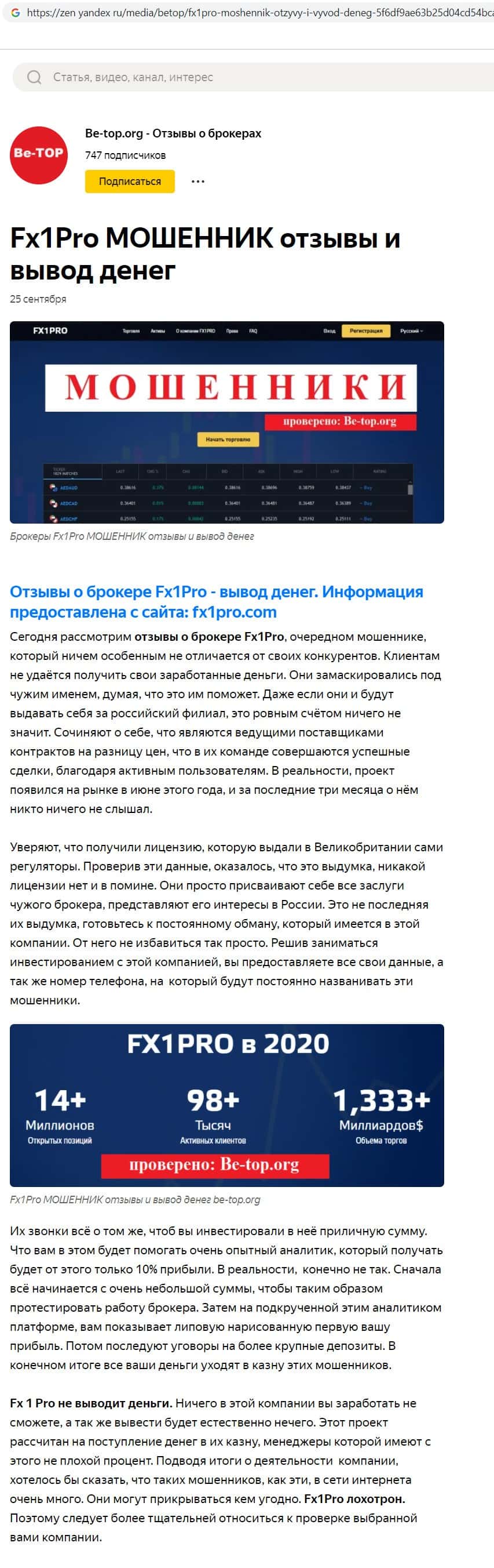 Так же на сайте zen yandex ru мы нашли статью, в которой интернет ресурс указал, что с компании FX1Pro невозможно вывести денежные средства, компания просто присваивает их.