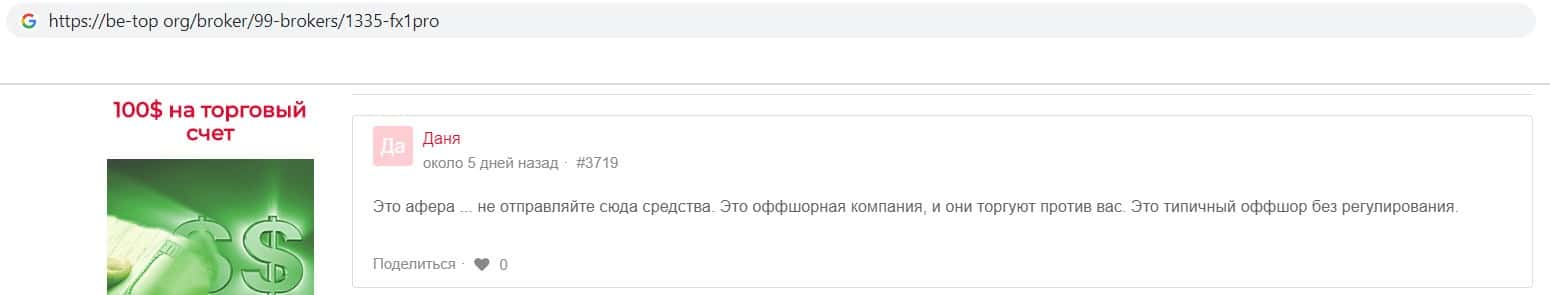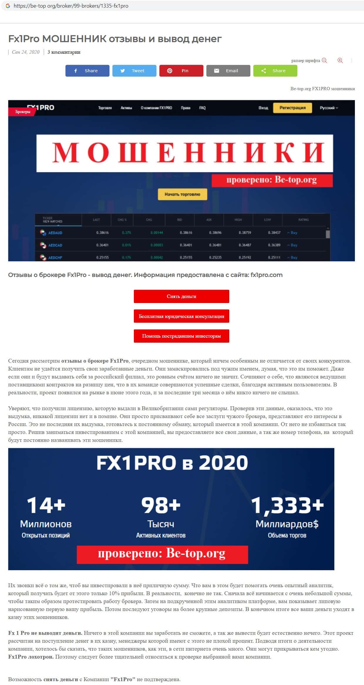 Интернет ресурс be-top org опубликовал статью с информацией о компании ФХ 1 Про, в которой указал, что компания является мошеннической и заработать там не получиться, так же как и не удастся вывести свои средства.