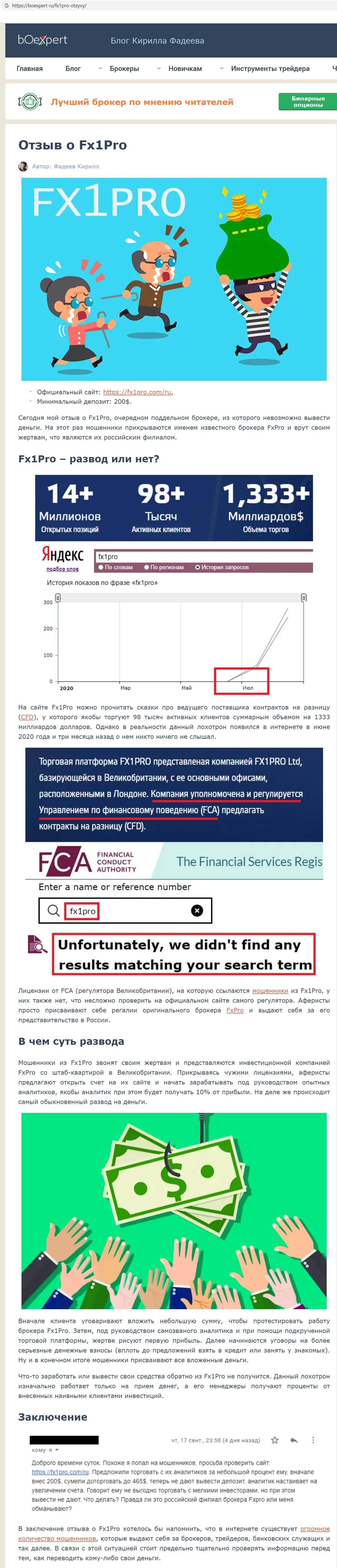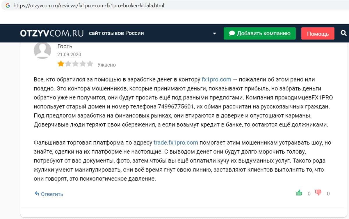 Так же на одном из интернет ресурсов мы нашли большую статью о компании кидал FX1Pro, в которой идёт речь о том, что мнение клиентов компании крайне негативное о ней, так как фирма развела их на деньги.
