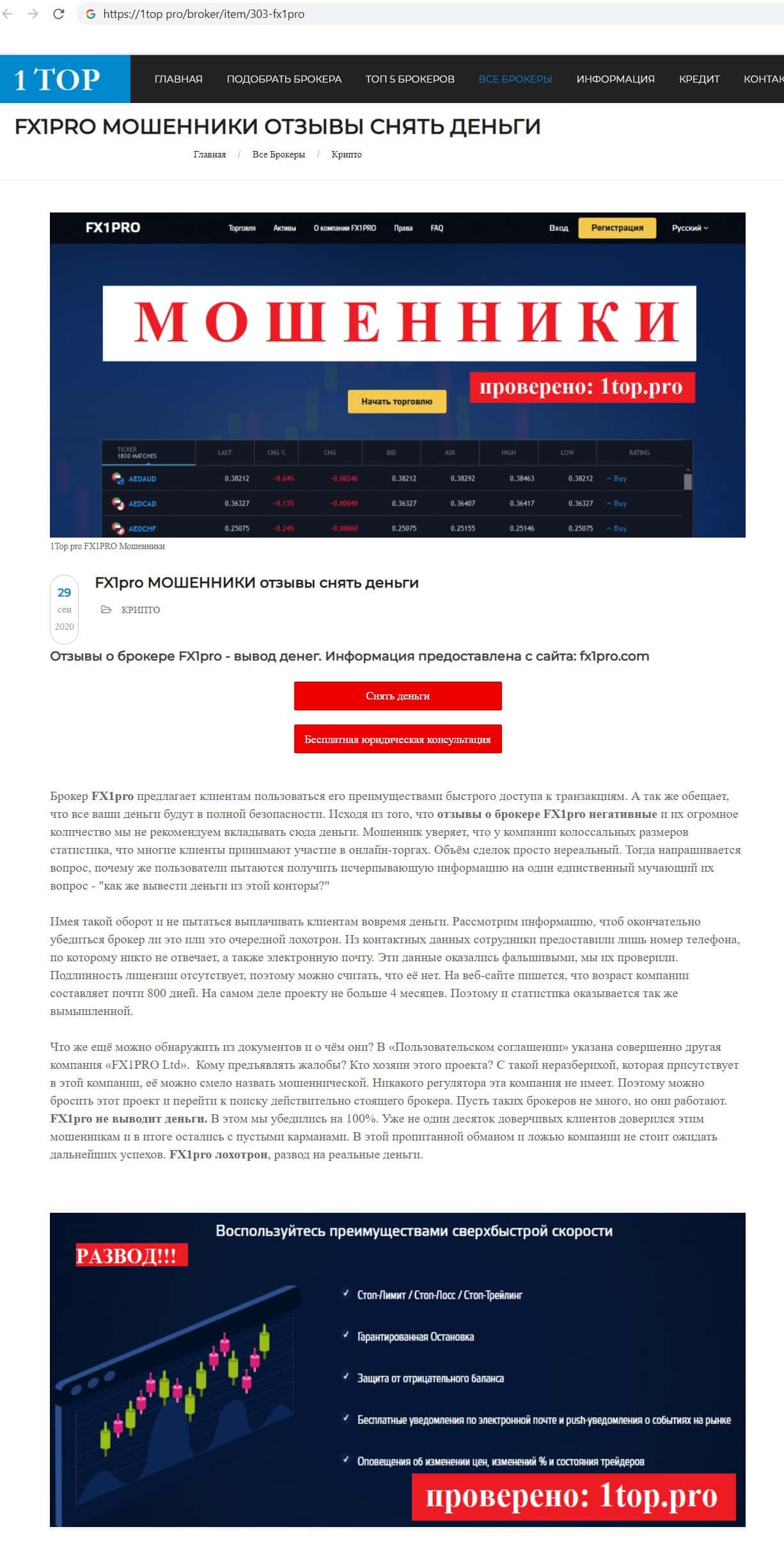 О компании финансовых разводил ФХ 1 Про мы нашли информацию на сайте 1top pro, где указанно, что данная компания является лохотроном, который не выводит денежные средства.