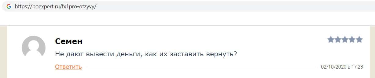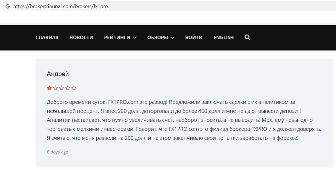 Очередной пользователь в своём отзыве назвал фирму FX1Pro - лохотроном. так как аналитик компании заставил его инвестировать средства, после чего помог их слить и компания отказалась выводит остаток депозита.
