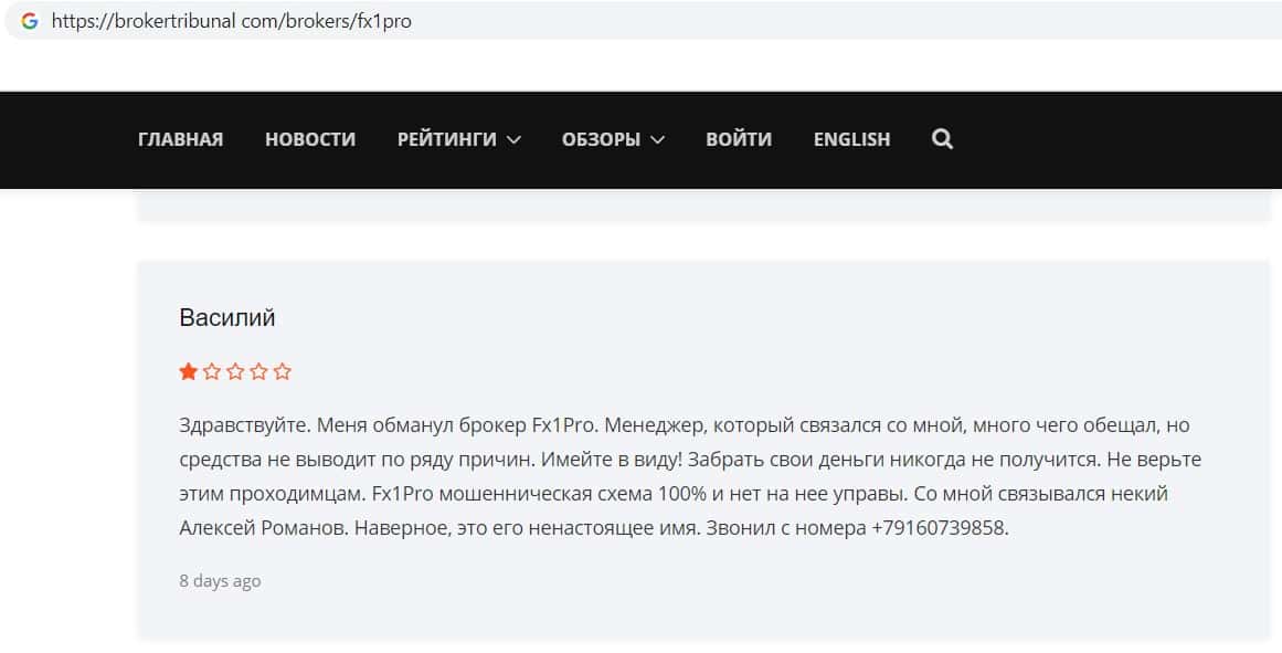 brokertribunal com - интернет ресурс с отзывами о кидалах FX1Pro