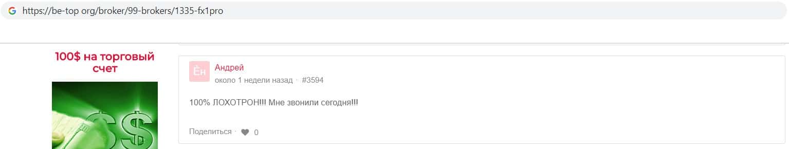 Ещё один пользователь написал негативный отзыв о компании ФХ 1 Про, в котором назвал фирмы - лохотроном. Так же добавил, что ему звонили из этой мошеннической организации.