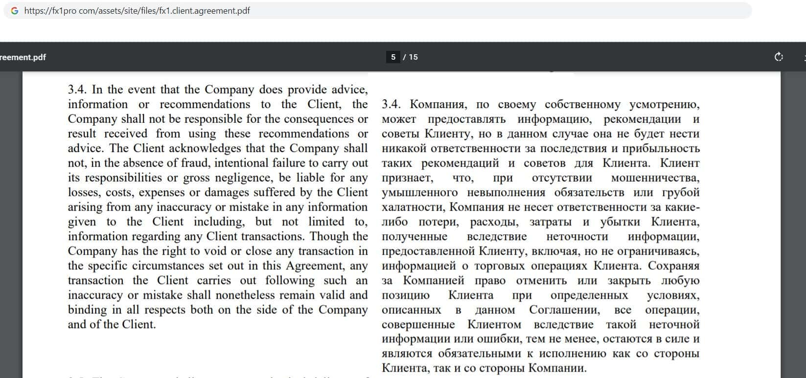 В своём клиентском соглашении. компания мошенников ФХ 1 Про указала, что имеет право давать рекомендации клиентам, но за точность предоставленной информации она не несёт никакой ответственности.